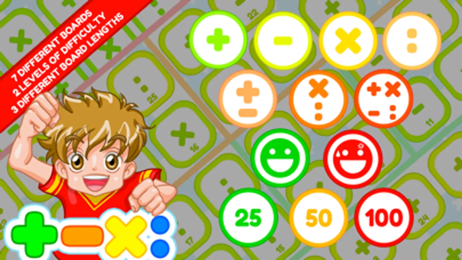 Different size boards: 25 cells for easier and faster games; 50 cells with the addition of more complex operations; 100 cells for longer and more taxing games.