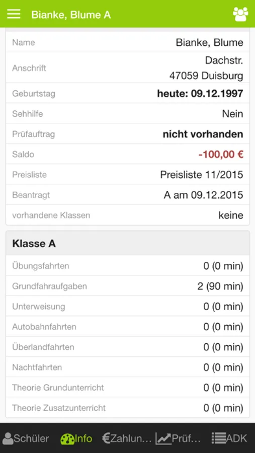 • Umfangreiche Schülerinformationen mit Kontaktdaten, Ausbildungsdaten, Saldo, etc.