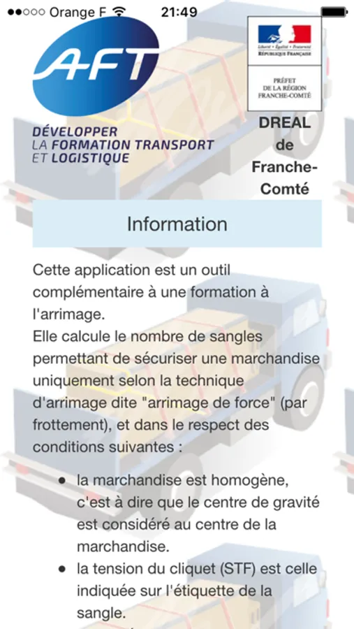 Cette application est un outil complémentaire à une formation à l'arrimage. Elle calcule le nombre de sangles permettant de sécuriser une marchandise uniquement selon la technique d'arrimage dite "arrimage de force" (par frottement), et dans le respect des conditions suivantes :