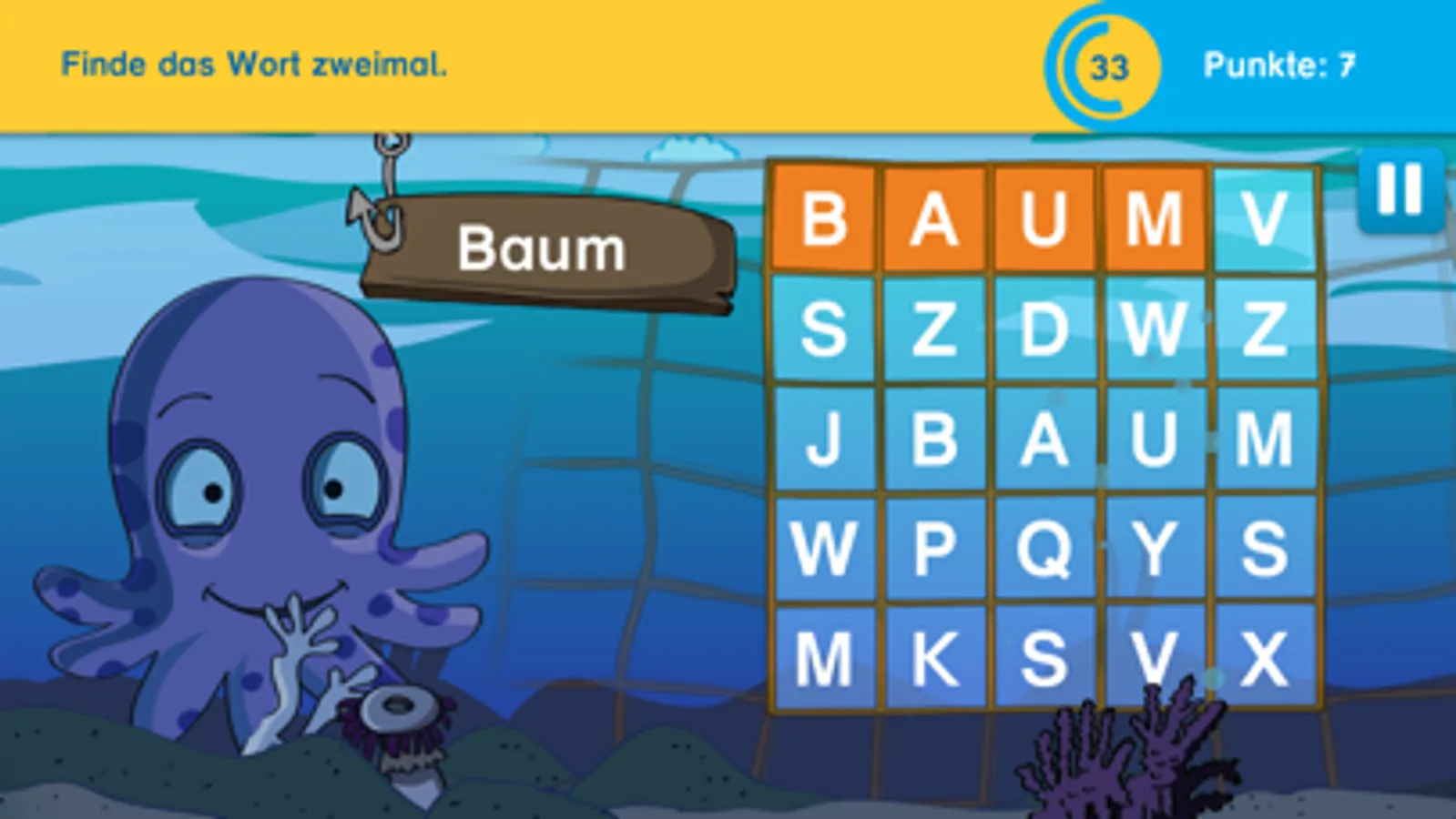 In einem Buchstabenfeld soll möglichst schnell das gesuchte Wort zweimal wiedergefunden werden.