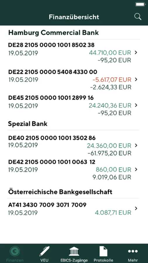 - Finanzstatus: Kontoinformationen, Vormerkposten, Auftragsstatus und Protokolle übersichtlich anzeigen lassen.