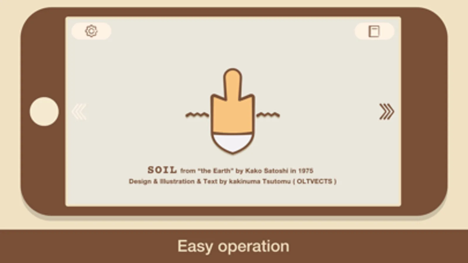 THIS is the app named "Soil" remade with afresh redrawing picture materials as focus on the soil as the main theme of the scene (terrains) from the masterpiece of Satoshi KAKO who is represent Japanese author of picture book, “THE EARTHE” (Chikyū : sono naka o sagurō) which was published in 1975.