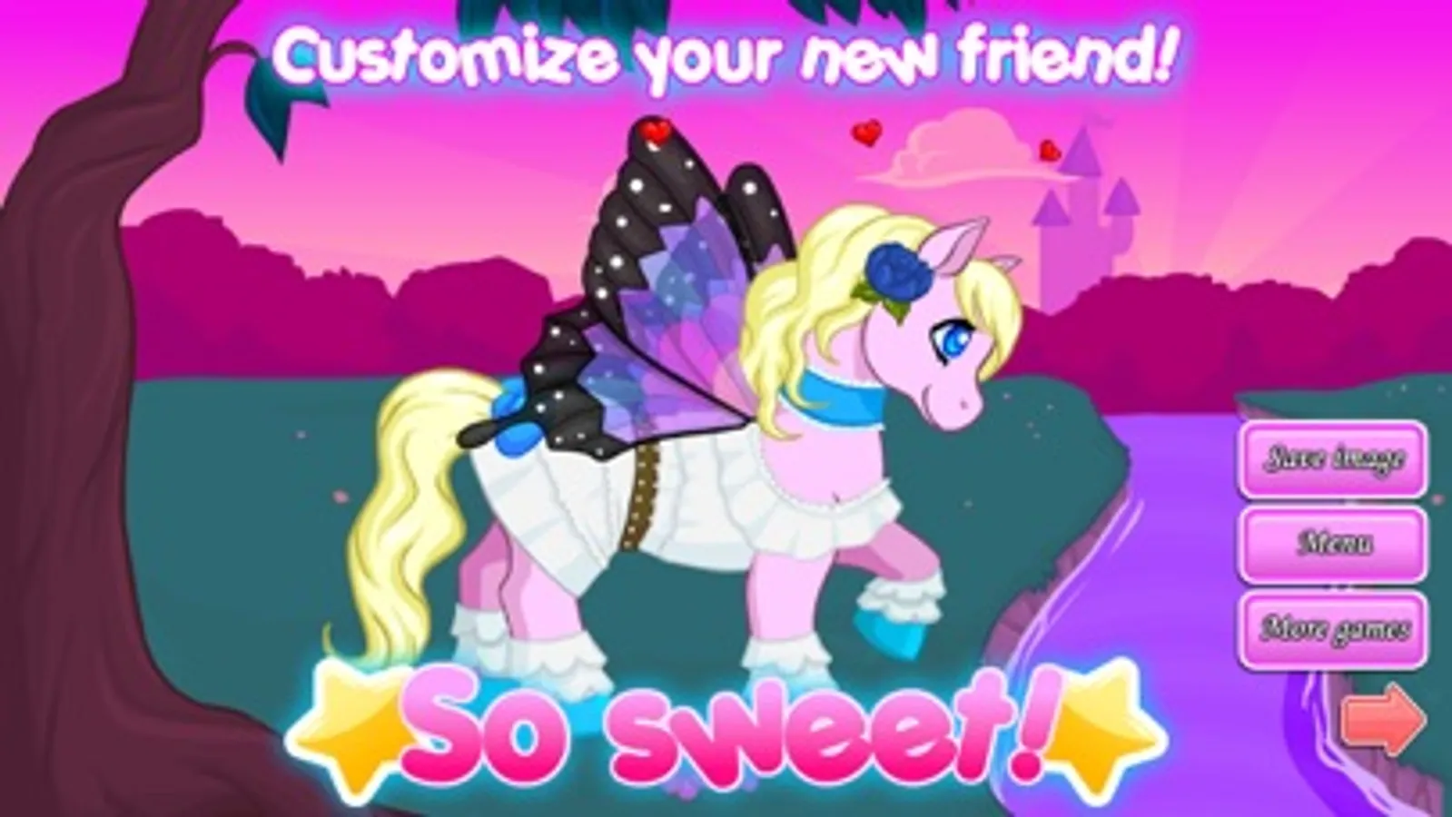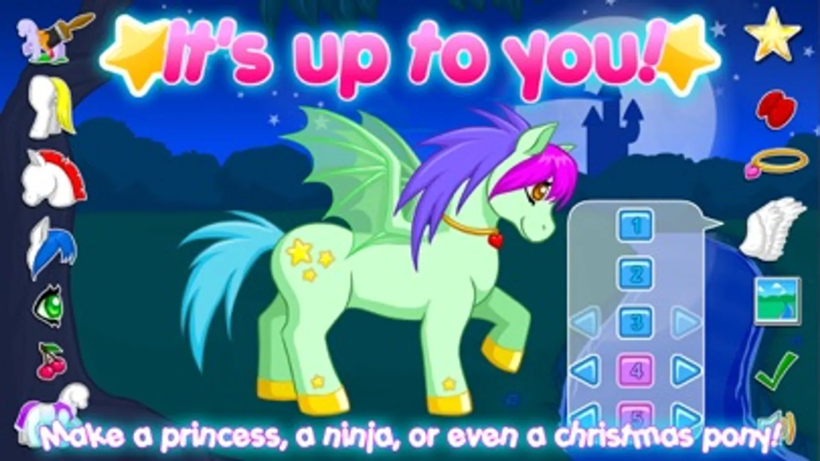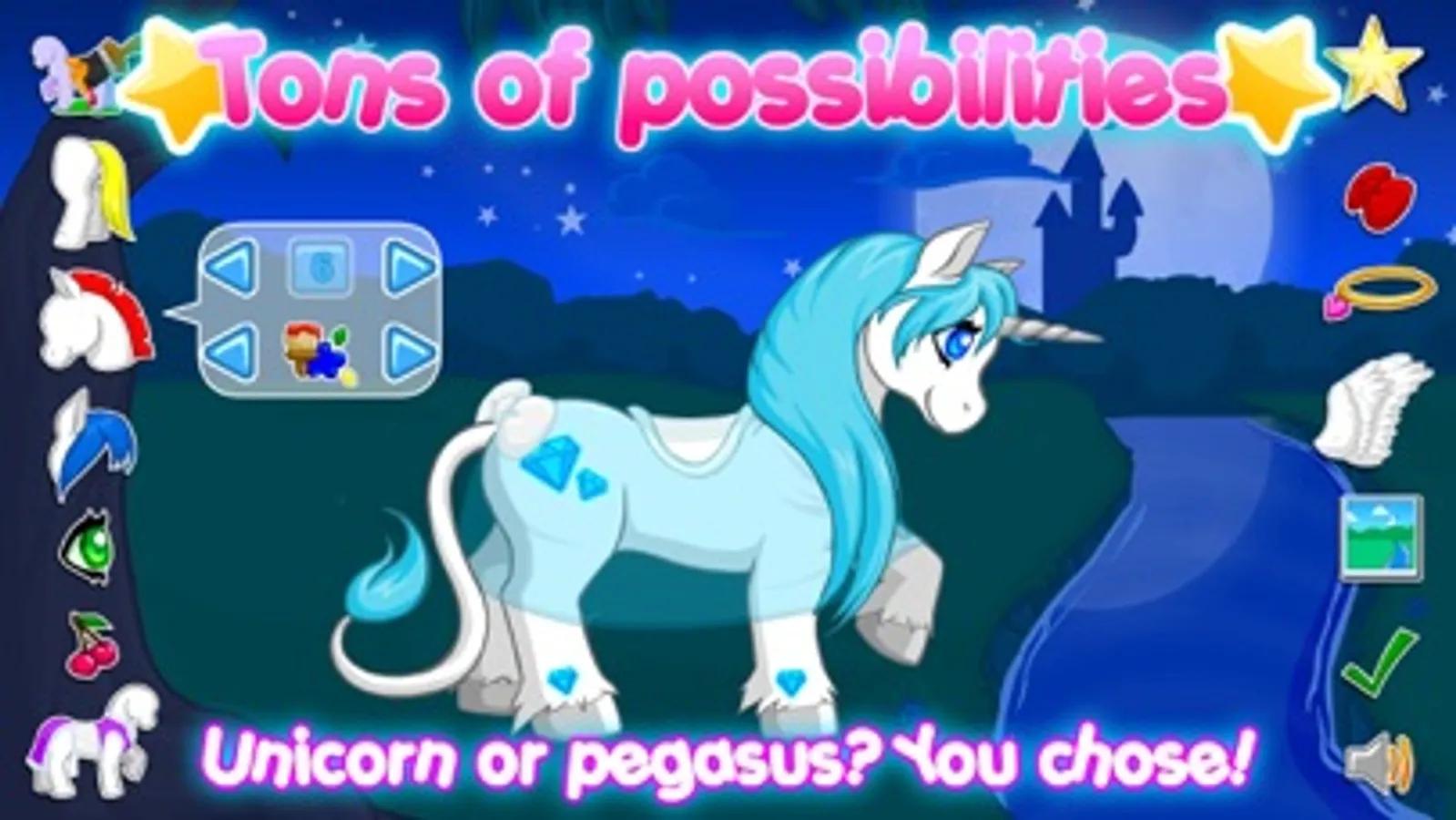 You have many options to customize your new friend. You can change its color, clothes, eyes, accessories, wings, paintings, you can even match its hair with yours! You want a princess pony? Try the dresses, long hair and maybe even the butterfly wings under a pink sky. You want something more wild?! Try a dragon wing under the full moon. There are countless ways to make your pony unique!
