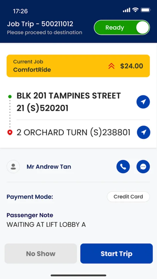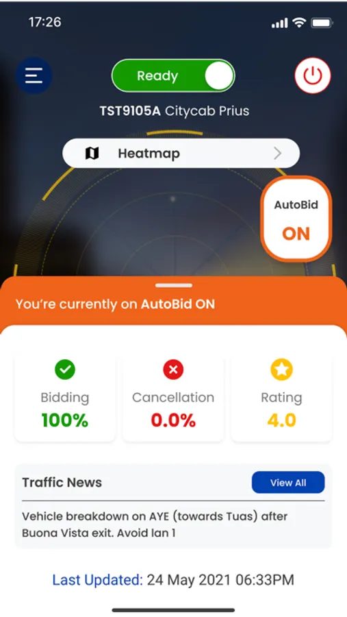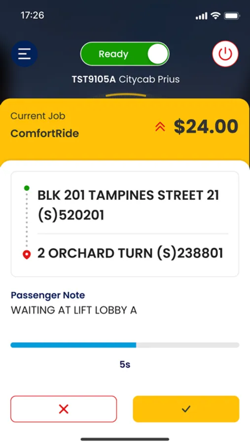 - Allows cabbies to toggle between being “Ready” to accept booking jobs or being “Busy”.