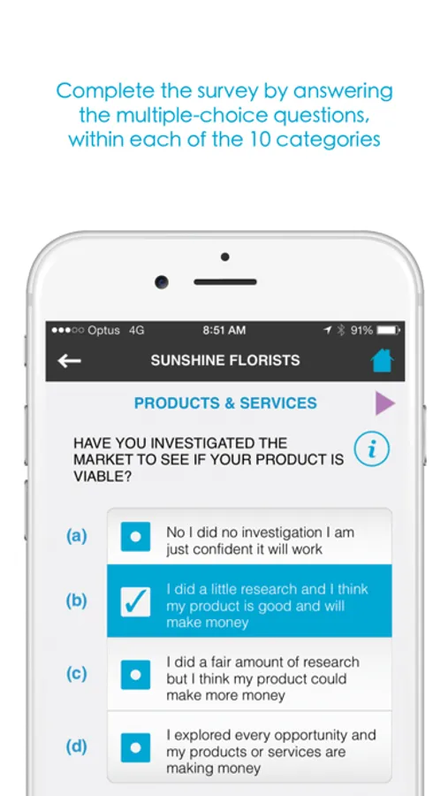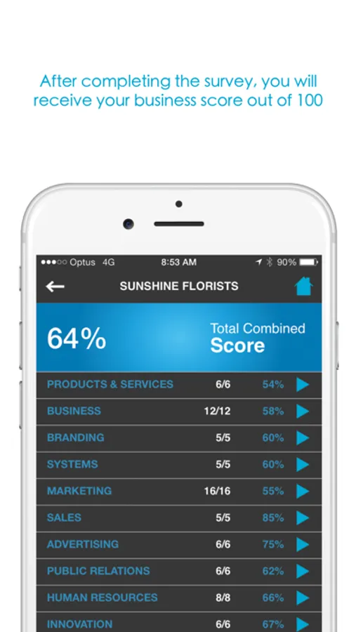 Complete the survey by answering the multiple-choice questions within the 10 categories, to receive your business score out of 100.