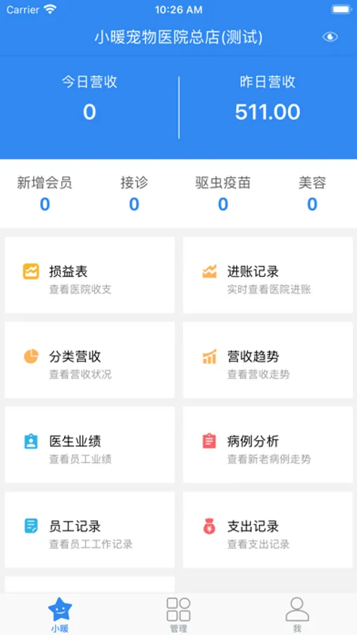小暖医生院长APP是小暖医生动物医院管理系统的一部分,以可视化图形实时展现医院运行情况,是动物医院管理者的医院移动管理工具。