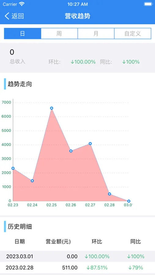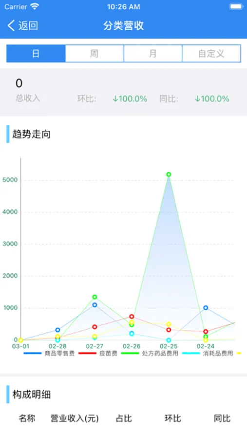 * 营收趋势,按日,周,月为统计周期分析医院营收金额和同比,环比数据;