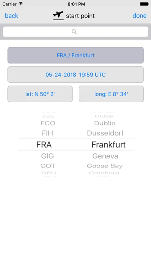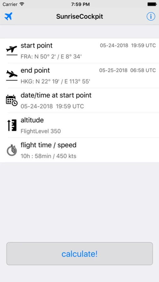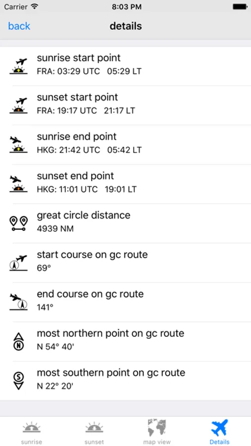 Other useful information such as sunrise/sunset at departure and destination airport, great circle distance and course angles are also calculated with and shown on a world map.