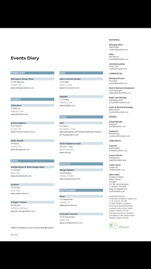 We know the lighting specifier community has high standards. That’s why arc features the best photography, the best writers, high-quality paper and a large format that shows off its projects in the best possible light. arc is highly respected for its independence and is a must read within the lighting design and architecture professions.