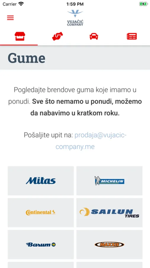 Posjedujemo širok asortiman proizvoda u kojem je teško da ne nađete proizvod koji vam odgovara. U maloprodajnom objektu se mogu naći gume iz grupacije Continental, koja je lider kvaliteta u svjetskoj industriji guma i to od sljedećih proizvođača (robnih marki grupacije): Barum, Semperit, Uniroyal, General Tire, Continental i Mitas. Za ove robne marke guma firma Vujačić Company je generalni distributer na crnogorskom tržištu. U maloprodajnom objektu se mogu naći gume za putnička vozila, 4x4 vozila, kombi vozila, motocikle, teretna vozila, industrijska vozila, unutrašnje gume itd.