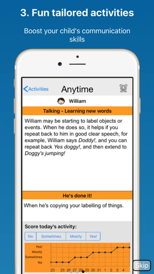 You record your child’s progress as you do each activity using the simple scoring system. A progress graph show improvement over time.