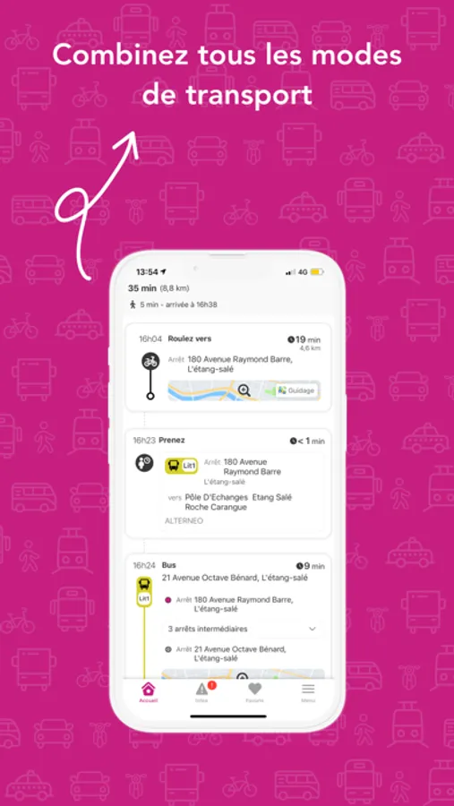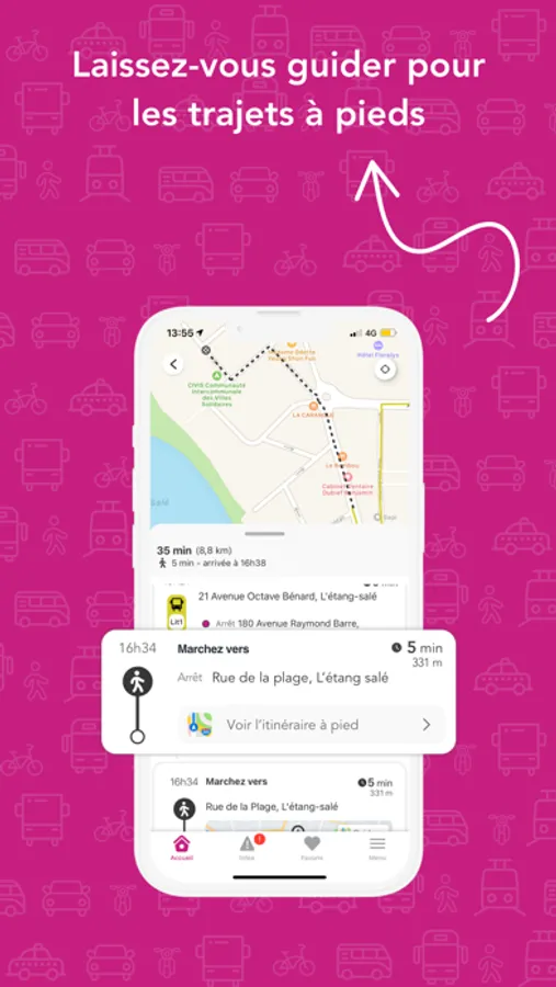 - Itinéraire personnalisé : Renseignez votre point de départ et votre destination : l’application vous proposera les solutions en bus les plus efficaces avec un descriptif de votre trajet étape par étape. Vous pouvez également préciser l’heure de départ ou d’arrivée souhaitée, choisir entre le trajet le plus rapide et celui qui propose le moins de correspondances.