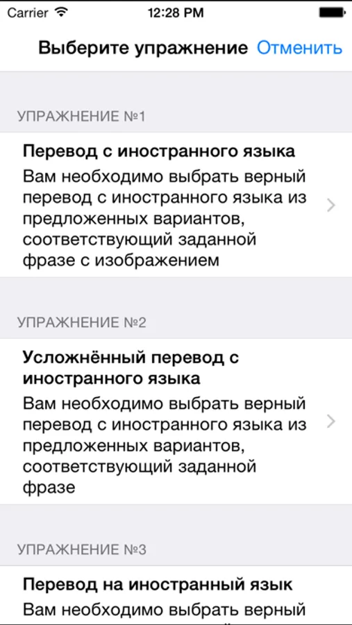 • 9 упражнения на проверку и закрепление знаний: "Перевод с иностранного языка", "Усложнённый перевод с иностранного языка", "Перевод на иностранный язык", "Визуально-интуитивная тренировка", "Усложнённая визуально-интуитивная тренировка", "Диктант", "Угадайте слово", "Интуитивная тренировка", "Произношение"