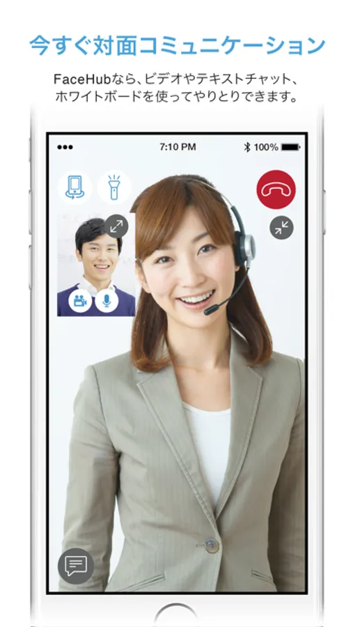 ライブで対面コミュニケーションできる機能です。ビデオの拡大・縮小、カメラのイン・アウト切替、マイク&ビデオのON-OFFなどができます。