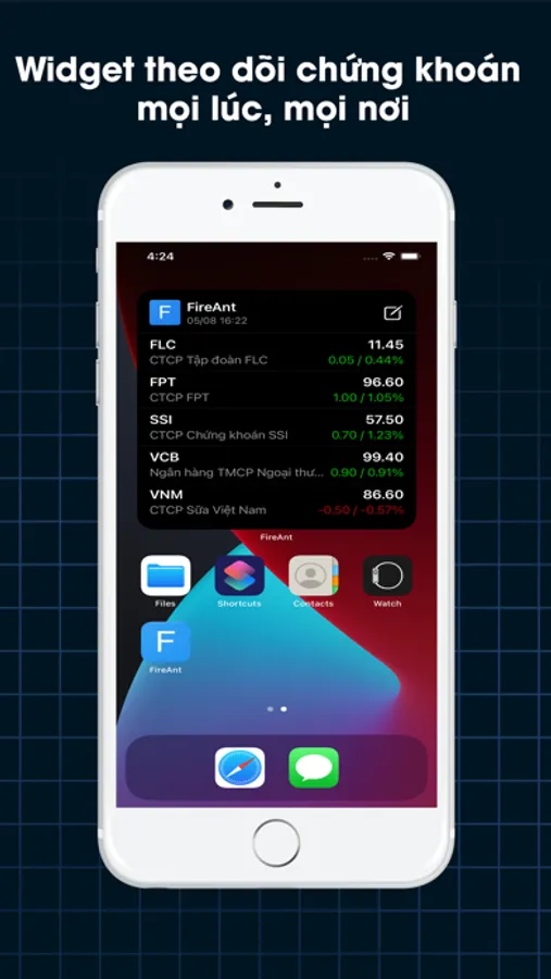 FireAnt Mobile là phần mềm theo dõi thông tin và hỗ trợ đầu tư chứng khoán, tài chính tốt nhất trên điện thoại hiện nay. Phần mềm cho phép người sử dụng cập nhật các thông tin mới nhất về thị trường tài chính, chứng khoán, theo dõi các cổ phiếu quan tâm, những thống kê chuyên sâu, tin tức... Phần mềm cũng cung cấp nhiều công cụ cho phép nhà đầu tư phân tích, tìm kiếm cơ hội đầu tư trên thị trường.