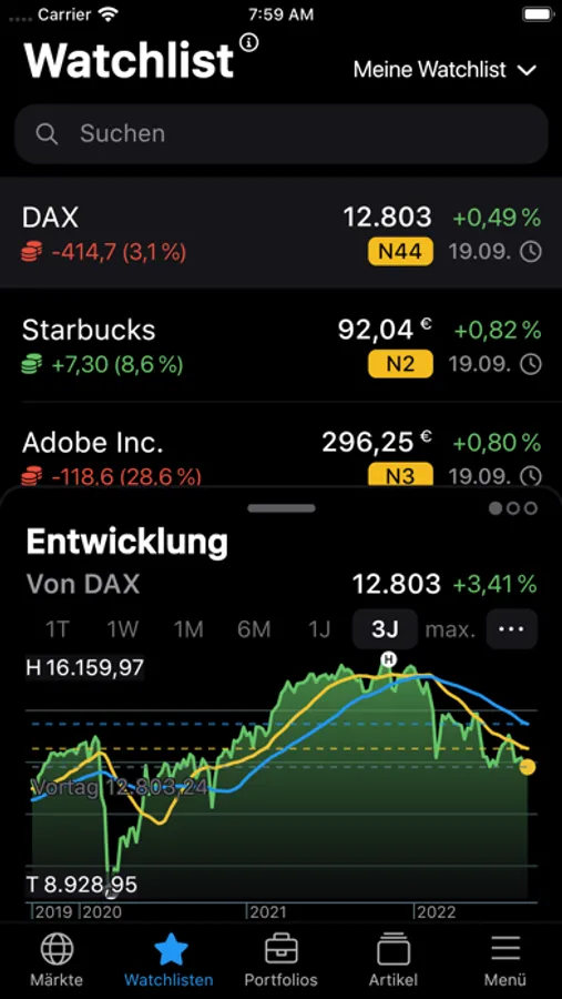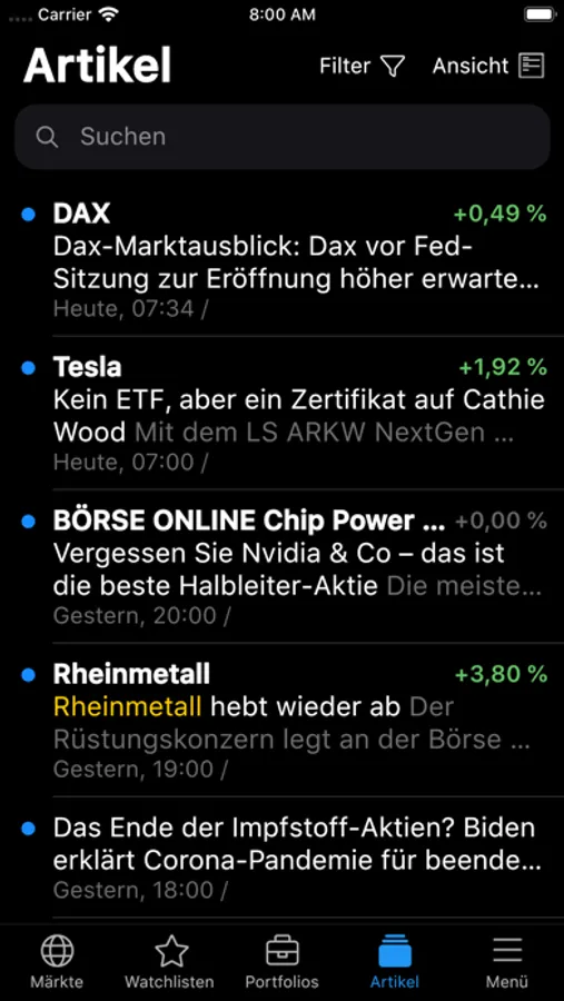 - Verschiedene Watchlists: Erhalten Sie aktuelle Push-Nachrichten, sobald die BÖRSE ONLINE-Redaktion über einen Wert aus der Liste berichtet. Manuelle Pflege von Kaufkursen und Stückzahlen sowie eine individuelle Sortierung möglich.