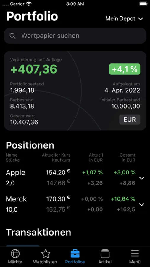 - Direkthandel einzelner Aktien über den InAppBrowser (derzeit nur flatex)