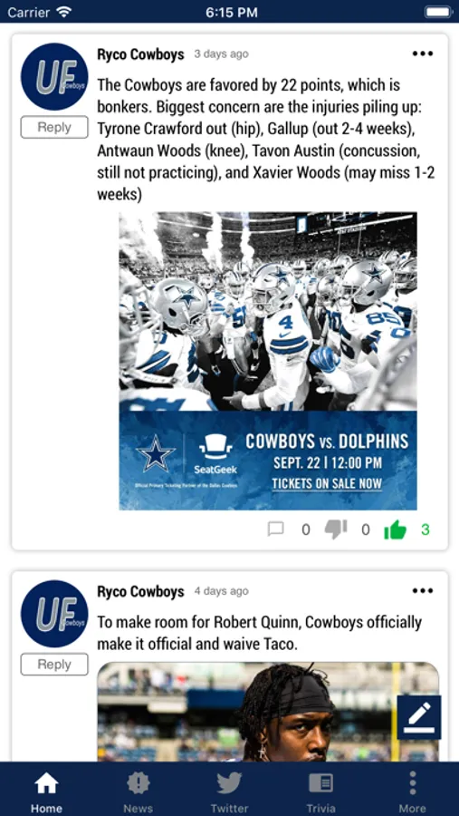 UltimateFan: Dallas Cowboys is your one-stop app for news, twitter and trivia about the Dallas Cowboys. Follow the latest news and blog articles, discuss with other fans, keep current on twitter, and take the trivia quiz game to relive the Dallas Cowboys legendary history and see how you stack up against the rest of Cowboys Nation.