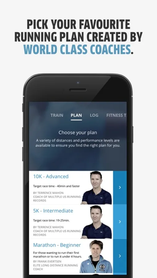 - Training plans for a variety of distances created by elite professional coaches: “Start Running”, 5K, 10K, and Marathon