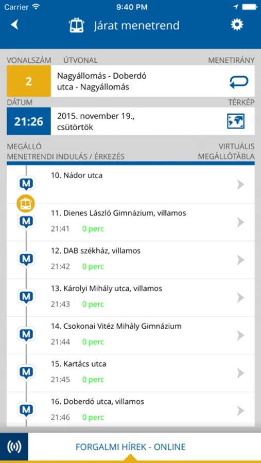 - térkép útvonalnézettel, megállókkal, aktív járatokkal