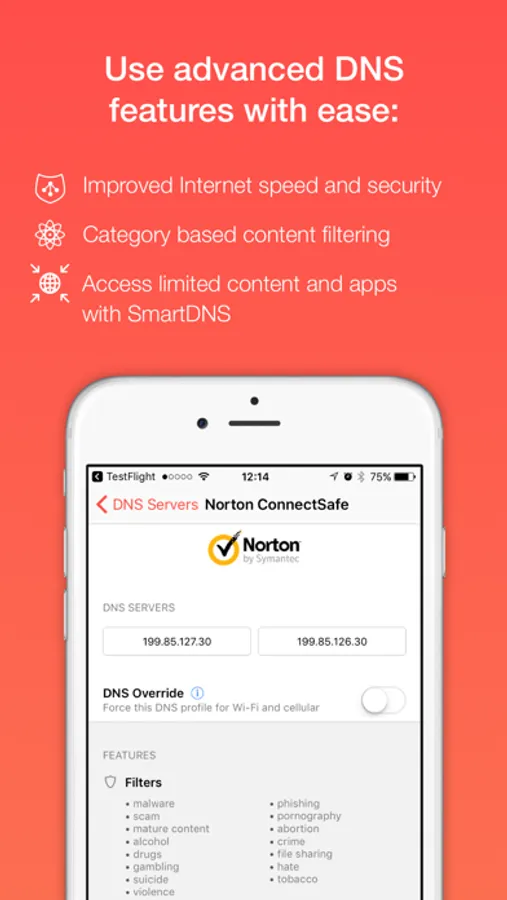 DNS Override is the first and only app that lets you quickly and easily set and change DNS server preferences on your iPhone or iPad. You simply choose from several popular public DNS providers, such as Cloudflare, OpenDNS, Google Public DNS, Norton ConnectSafe and more.