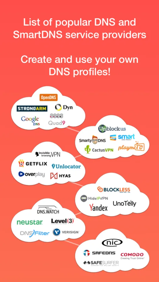 DNS Override delivers a direct, fast, and secure connection between your device and your designated DNS provider. There is no active VPN link passing all your traffic to any third party and slowing down your Internet. The app provides you with a regularly updated list of DNS addresses.