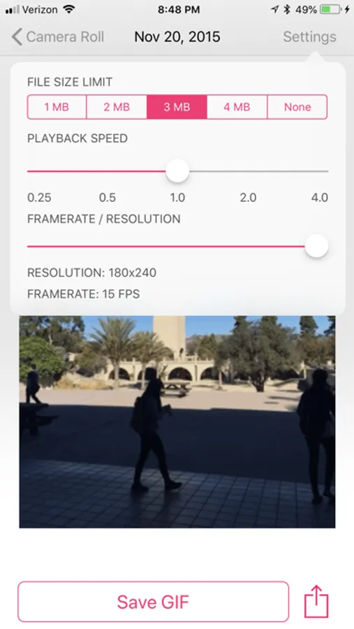 • The resolution and framerate of the resulting GIF are displayed after it's converted.
