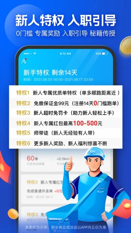 0门槛:新人免缴保证金,不限学历和经验,认证后即可开启跑单(新骑士无装备、制服等硬性要求);