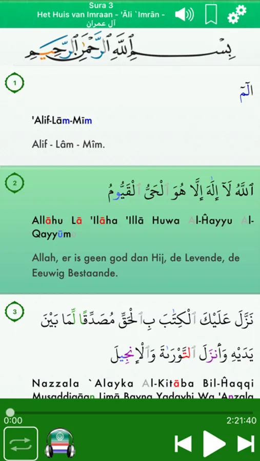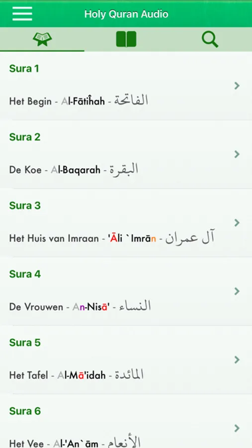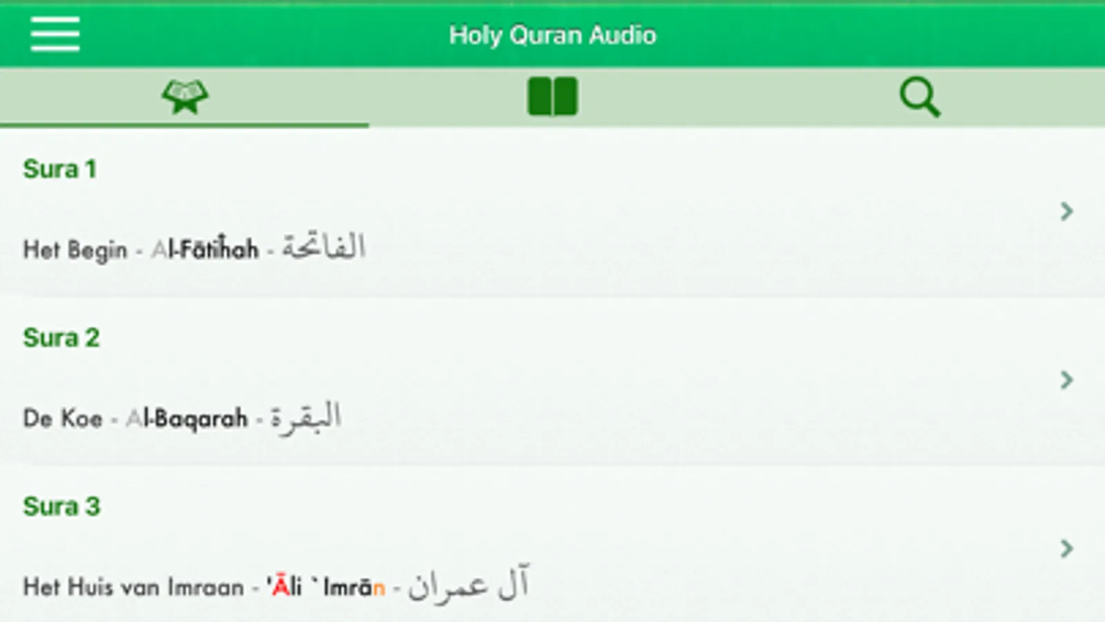 Deze applicatie geeft u de mogelijkheid om te lezen en te luisteren naar alle 114 hoofdstukken van de Heilige Koran op uw apparaat.