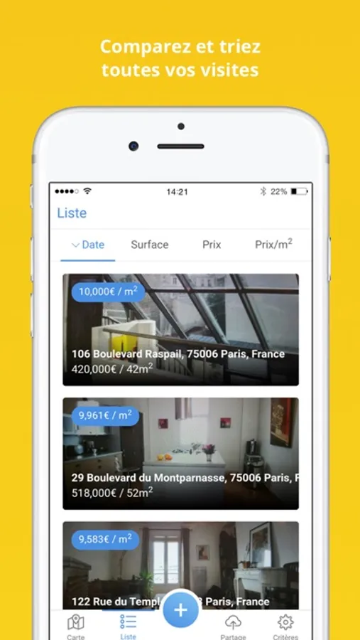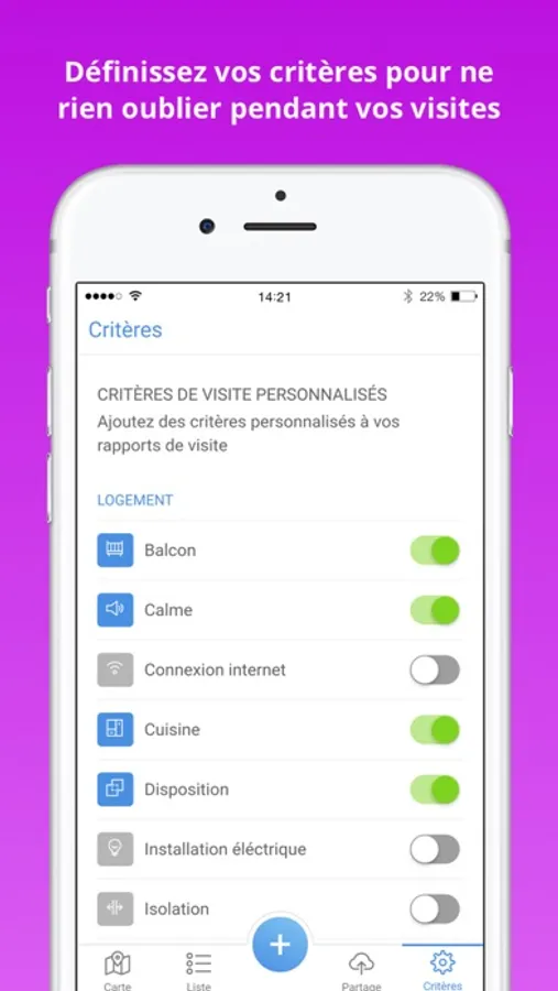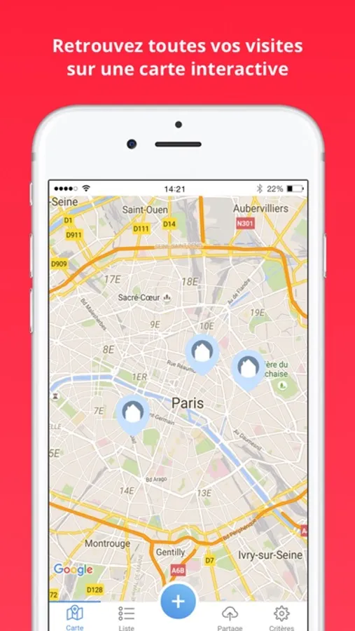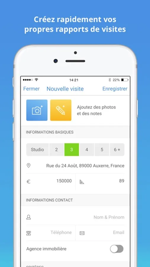 - Capturer facilement toutes les informations pendant votre visite immobilière (coordonnées, contact du vendeur, localisation, photos, évaluation des critères, prise de notes, favoris...).