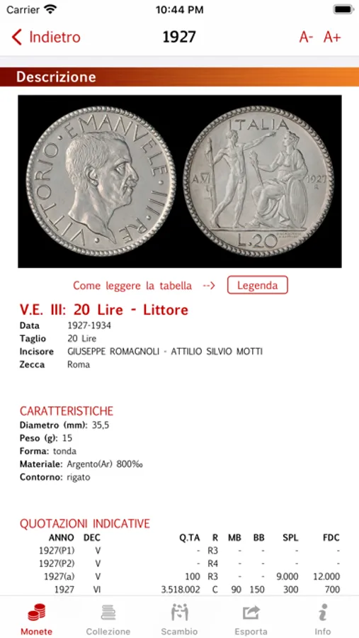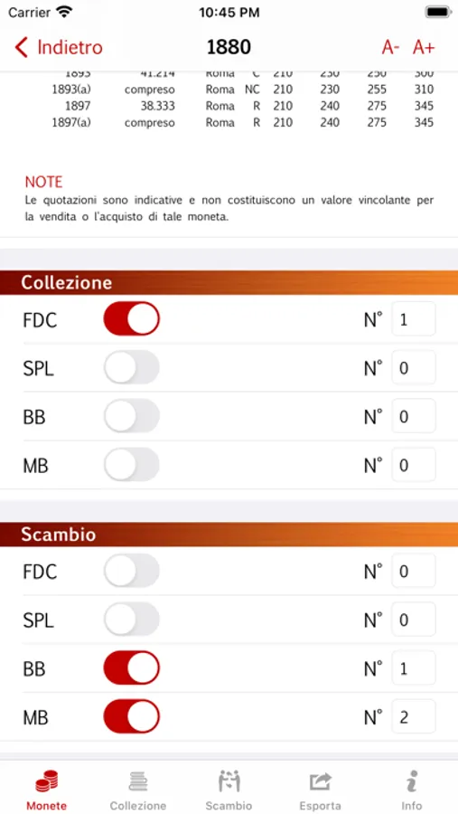 - Catalogare la tua collezione per numero e stato di conservazione di ogni moneta