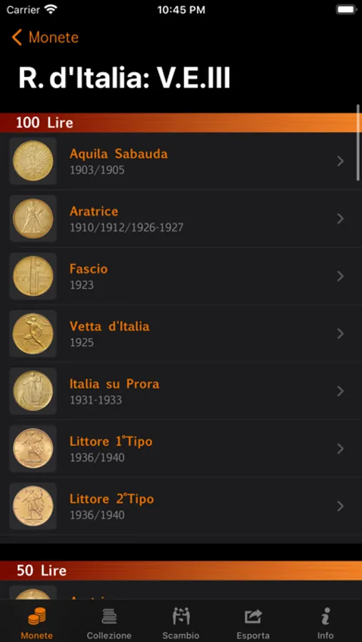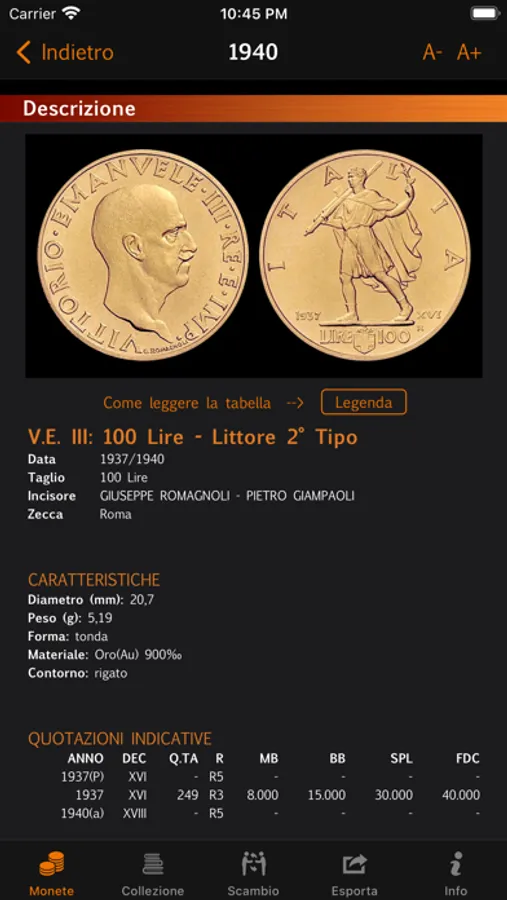 - Vedere il riepilogo completo della collezione, sia per anno di emissione che per valore