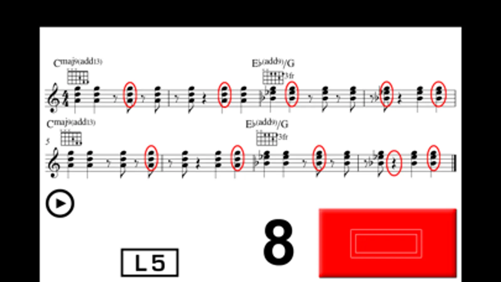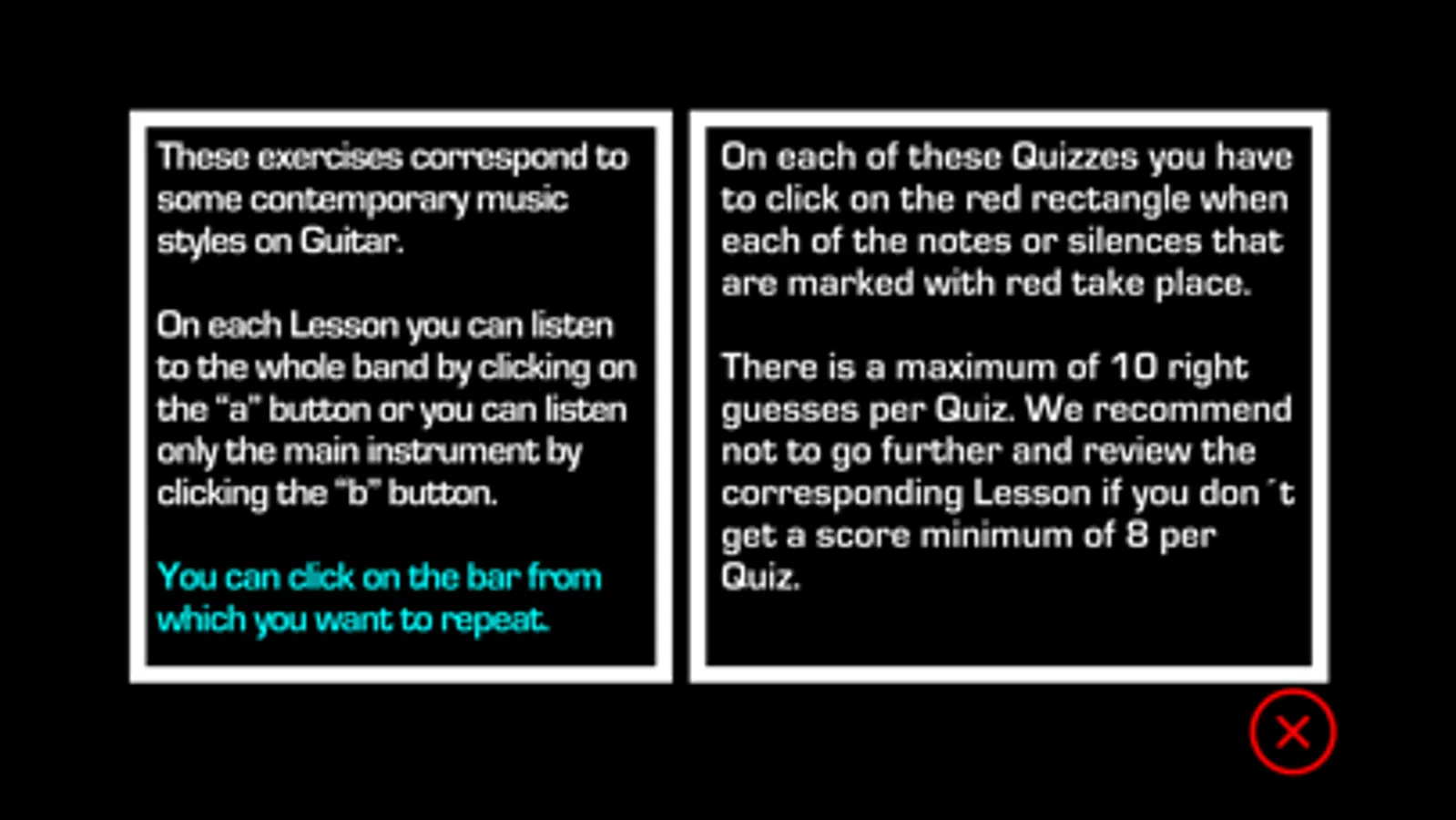 Is to practice sight reading of rhythms for Guitar on different time signatures. On each exercise you have to click on a button when each of the notes or silences that are marked with red on the staff takes place.