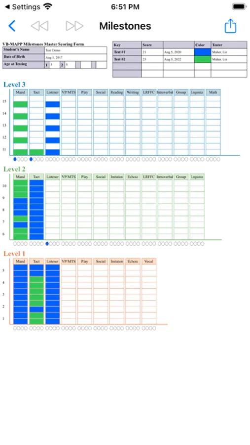The objectives, materials, examples and scoring criterion are readily accessible as part of each question, making the process of conducting the VB-MAPP assessment much, much easier. The results are plotted on the scoring forms automatically saving you a significant amount of time.