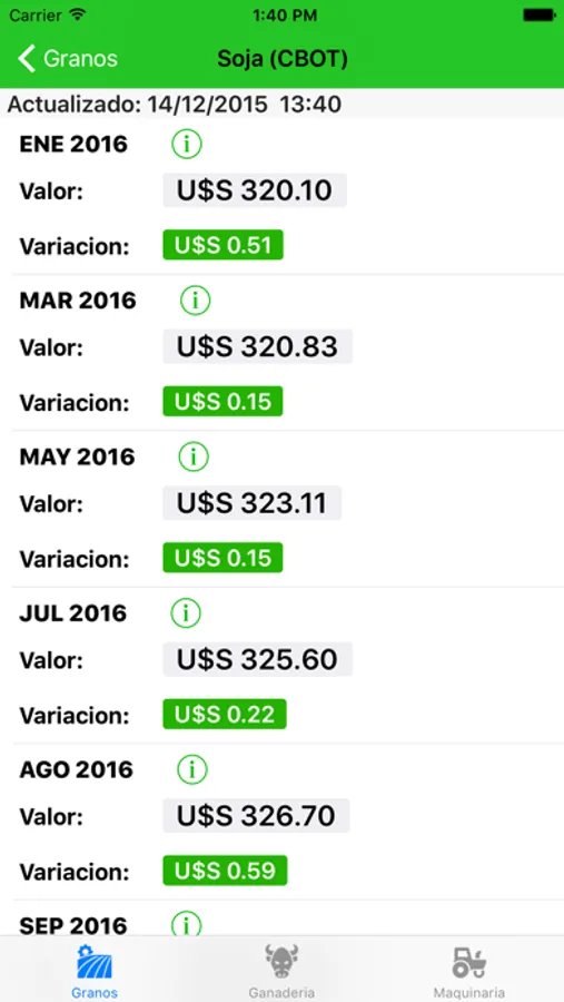 Aqui podrás ver las cotizaciones de la bolsa de Chicago (CBOT) del momento y también un histórico de 7 días para atrás.