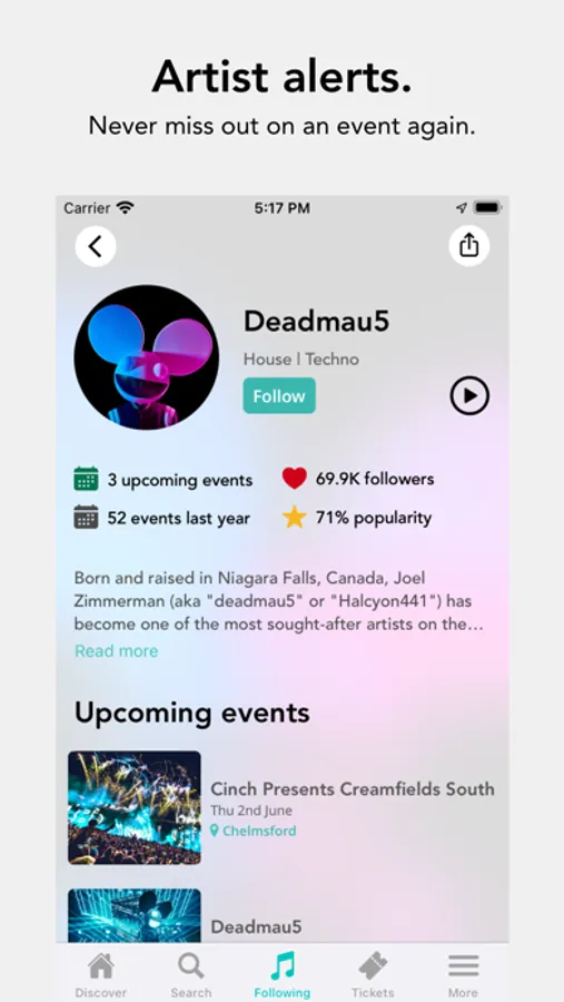 * Track artists using our Apple Music and Spotify sync and get alerted when your favourite bands/DJs play near you.