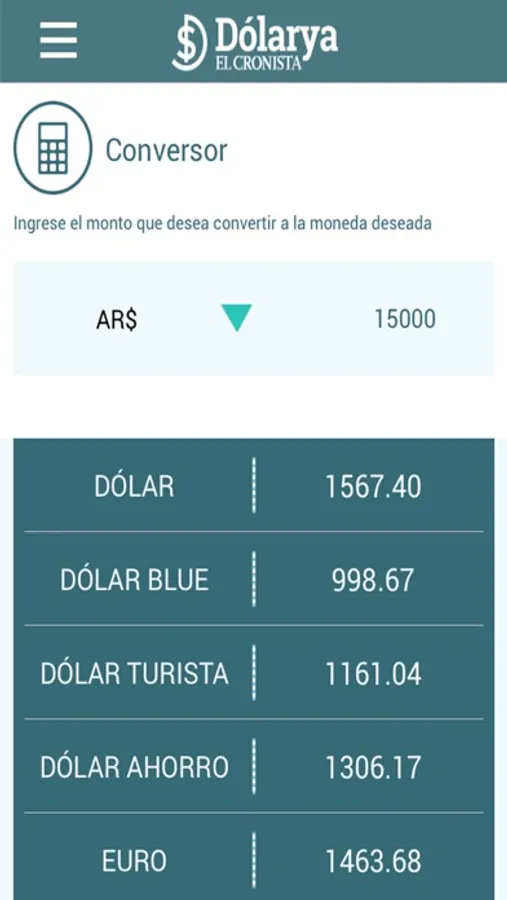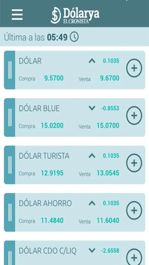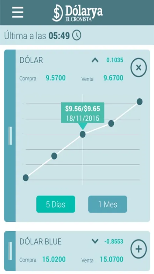 Con el respaldo de El Cronista Comercial, DólarYa es la mejor aplicación para conocer en tiempo real la cotización del dólar en la Argentina. Conocé en el momento el valor de la divisa estadounidense con un toque y recibí la cotización de la apertura y cierre del mercado en tu celular.