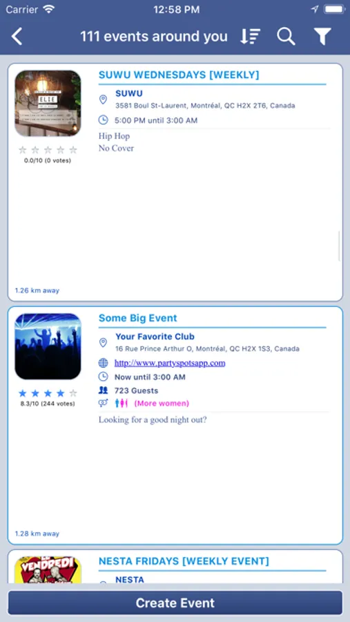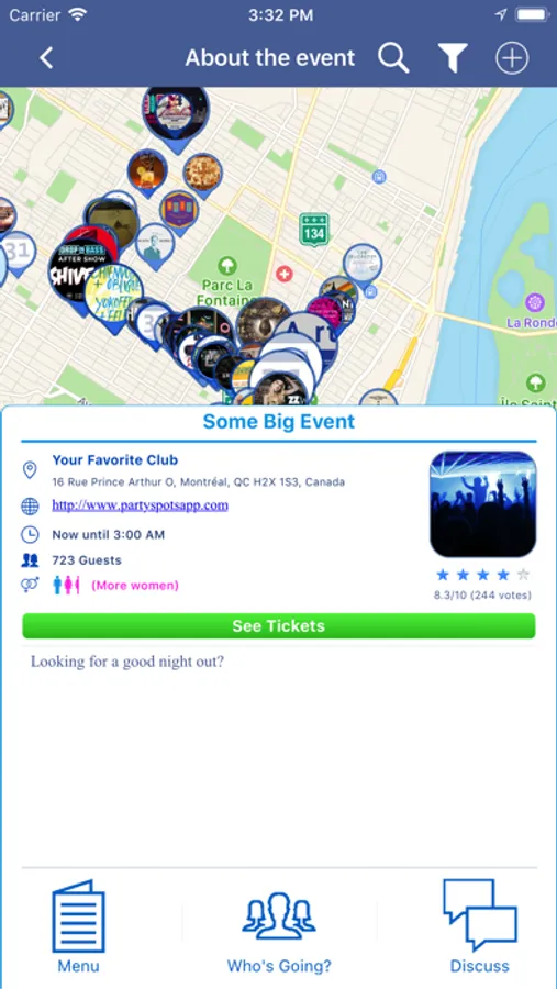 How it works: open the app and we show you the events happening around you right now. When you find what you're looking for, you can access real-time reviews, guest lists, special deals and some exclusive promotions.