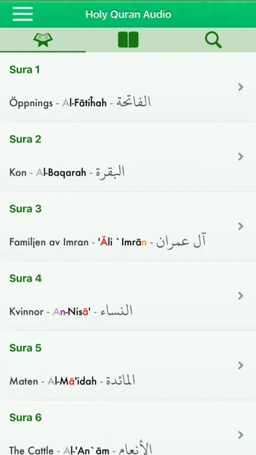 Detta program ger dig möjlighet att läsa och lyssna till alla 114 kapitel i den heliga Koranen på enheten.