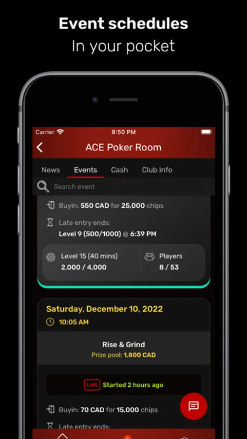 We’re here to help you find the best live poker tournaments and cash games in your area. You can also keep track of your friends, see who is playing where, and get all the information on upcoming events.