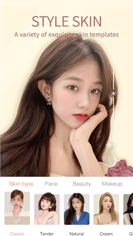 Best skin texture template comes online! There are 7 skin styles to choose, which are classic, soft, cream, soft foggy, original, texture, men style. Having model face in one click, more choose more beautiful.