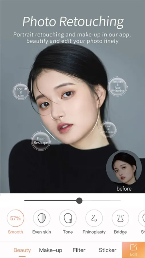Super lifelike makeup effect, without fear of all kinds of angles, all kinds of expressions, even when you are makeup-free, retouch skin tone using our exclusive skin smoothing tool with our camera.