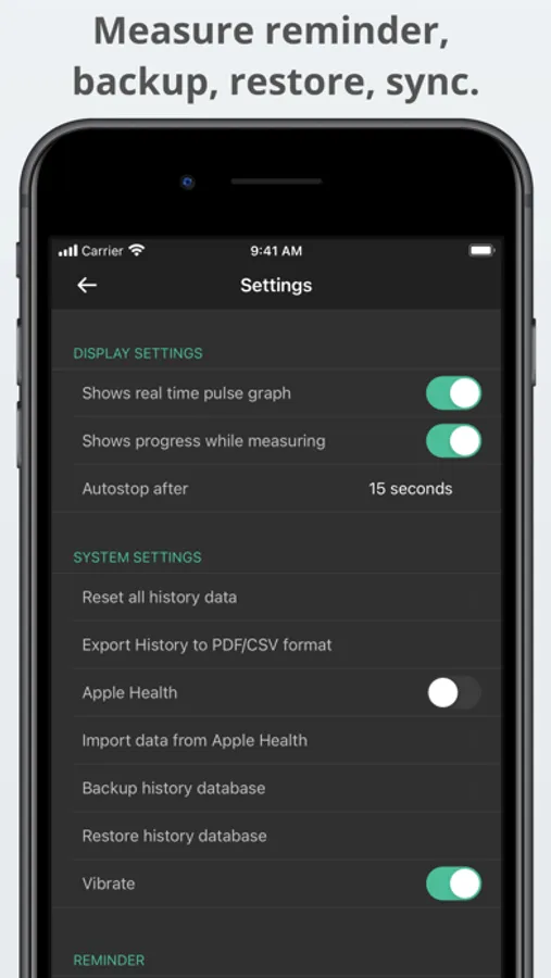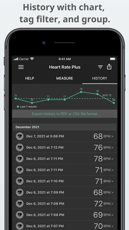 - Export history to CSV or PDF file format; PDF file includes PPG graph. (Premium)