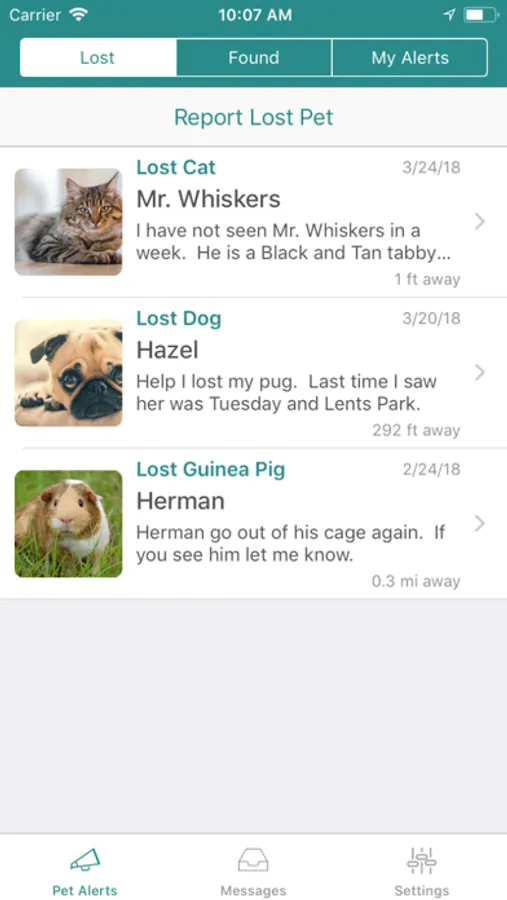 If you lose your pet, you can post an alert which is broadcast to all the users around you. When someone finds your pet, they can then use the app to contact you privately.