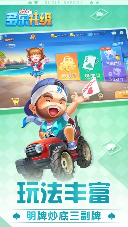 经典玩法,炒底玩法,五主过河玩法,连打玩法等。手握拖拉机,双升打到80分,就能翻身做庄家。