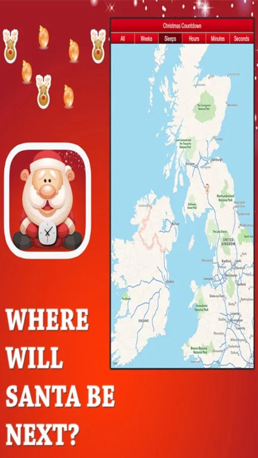 Countdown to Christmas using Santa's festive countdown timer, which not only lets you see exactly how long it is until the festive season is among us, but also by playing lots of well known happy festive songs as well to create the ultimate festive fun filled app!