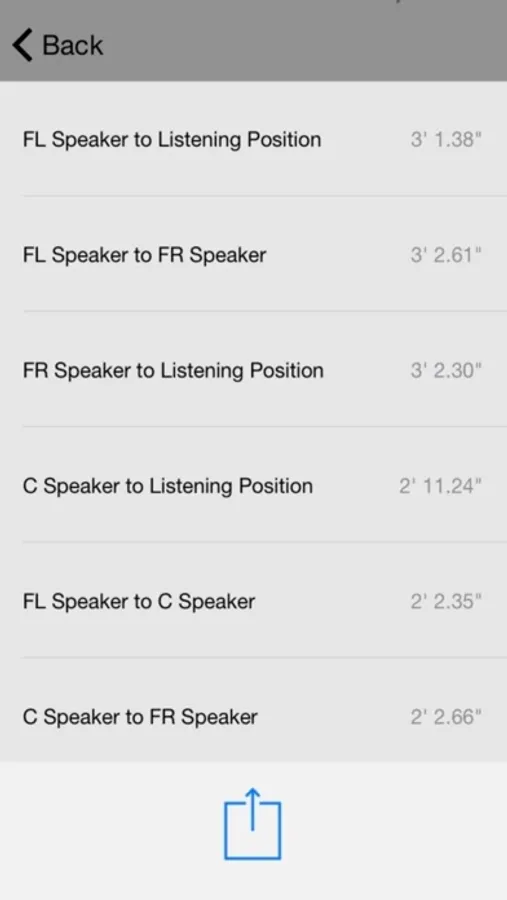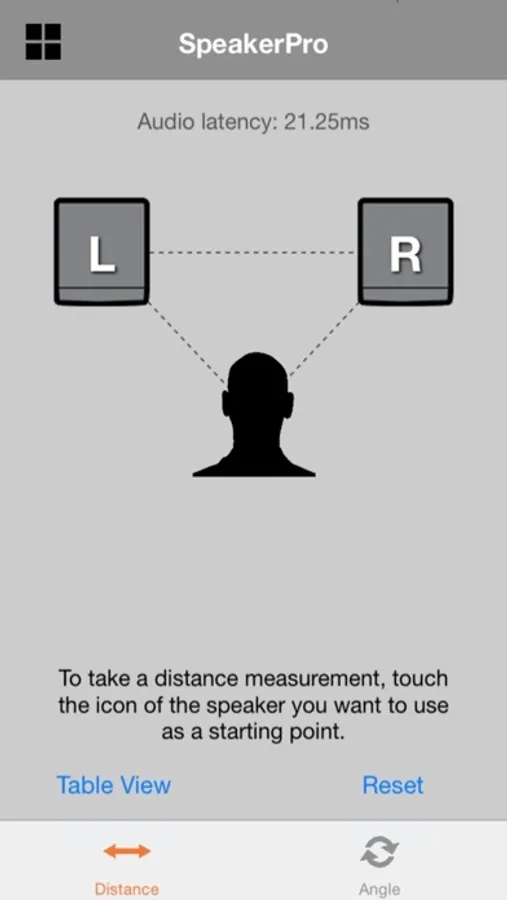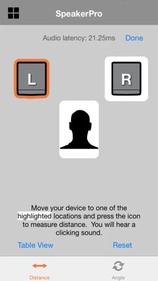 Measuring speaker distances and angles with SpeakerPro is easy. Begin by using an appropriate audio cable to connect the headphone output of your device to individual speakers or to your audio system. After taking a simple reference calibration, select the speaker you want to use as the starting point by touching its onscreen icon. Then place your device at the listening position (or next to another speaker) and touch its corresponding onscreen icon. SpeakerPro instantly displays the precise distance between the two points. You can choose to accept it, or to move the speaker and re-measure. Repeat the process as necessary to take distance measurements from other speakers in your system.