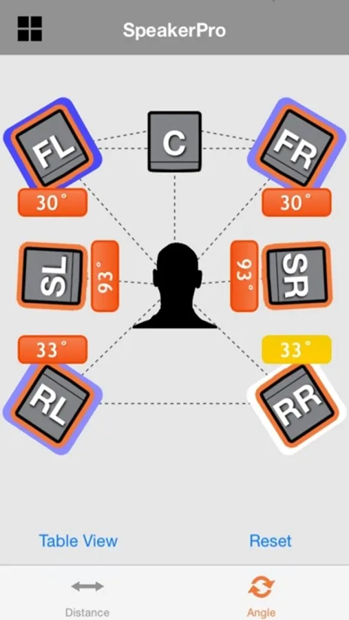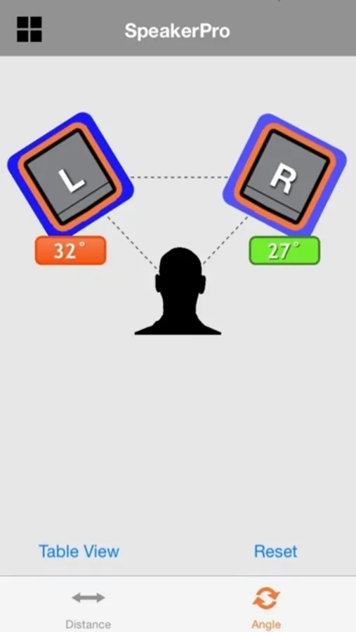 Once all your measurements are taken, touch the Angle icon to obtain intelligent speaker toe-in angle recommendations for your system. Begin by adjusting your speakers so they are facing straight ahead. Place your iPhone, iPad, or iPod Touch on top of one of the speakers and press the corresponding onscreen icon, then rotate that speaker towards the listening position. As you do so, SpeakerPro's onscreen display shows you the degree of toe-in, using color coding to guide you through a range of recommended angles. Next, do the same for the paired speaker in your system. A handy onscreen Reset button allows you to start from scratch at any time and experiment with different distance measurements and toe-in angles.