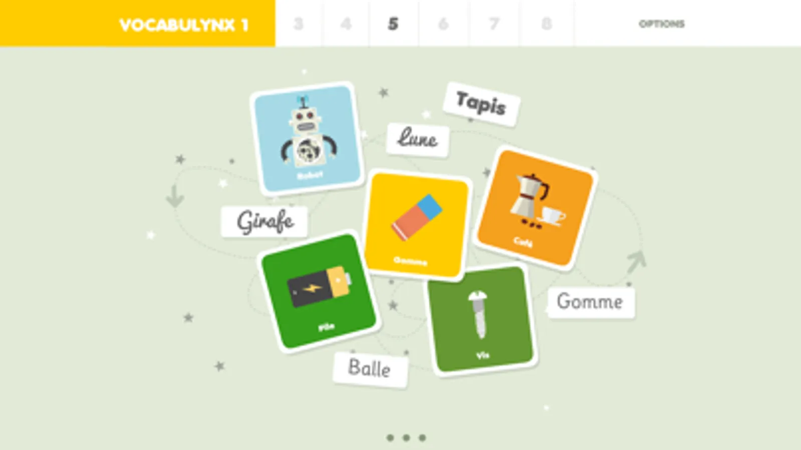 Cette version de VOCABULYNX correspond au niveau de lecture du CP ( sons a,e,i,o,u ) et peut être utilisée en autonomie par les enfants, il suffit de choisir un niveau de difficulté et d'essayer de trouver l'unique paire d'image/mot le plus vite possible ( ou pas ) !!