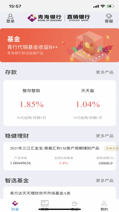 1、青海银行直销银行为您提供智选基金、多样存款、生活缴费、充值、提现、账户查询等服务。